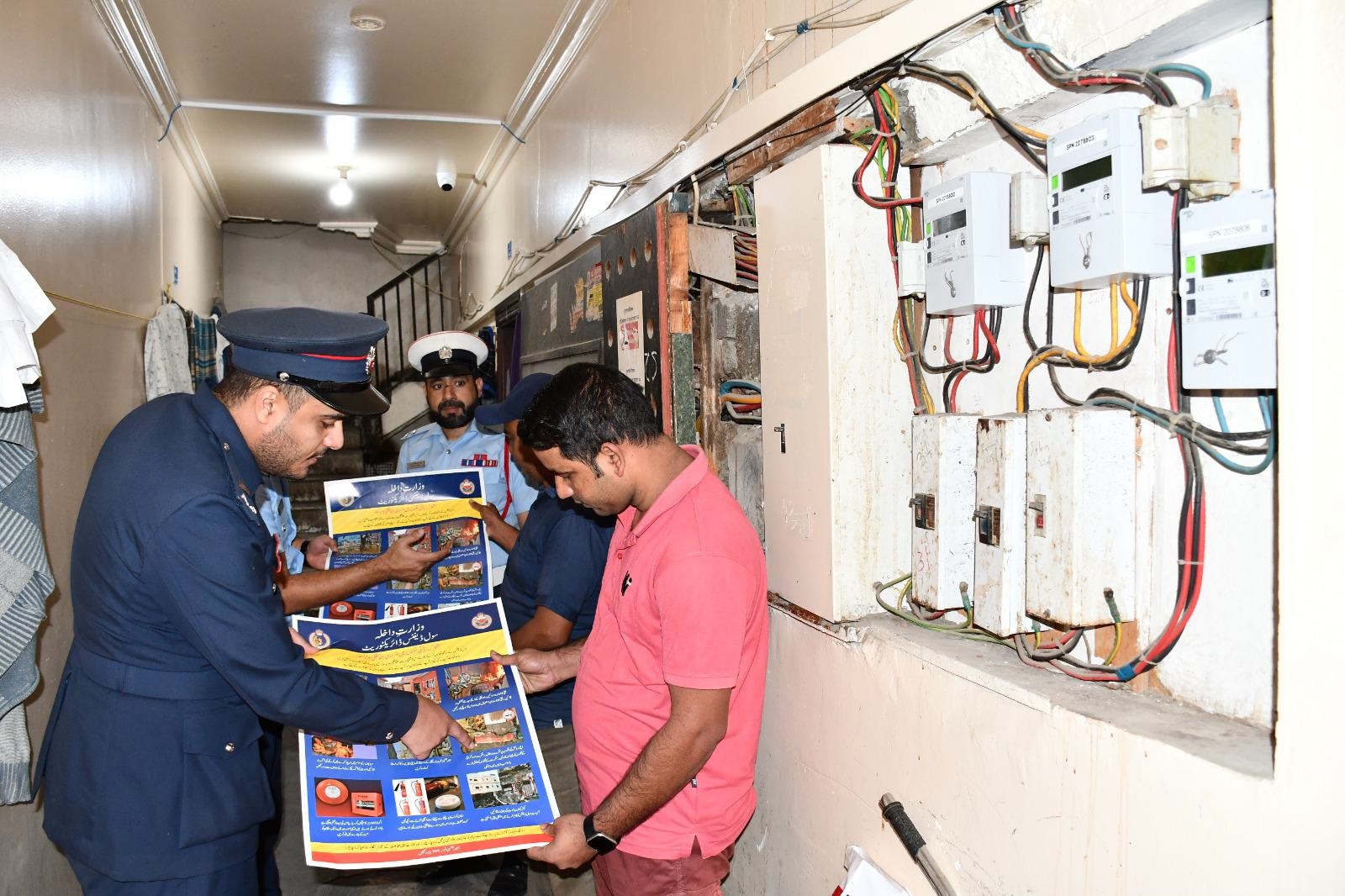وقد قام مكتب العلاقات العامة والتوعية بالإدارة العامة للدفاع المدني، بتشكيل فرق عمل متخصصة لزيارة المباني السكنية في عدد من الأحياء السكنية والأسواق، بالإضافة إلى زيارة بعض العمال في مقار عملهم، بهدف الوصول لأكبر شريحة ممكنة، لتقديم التوجيه والنصائح التوعوية، ورفع مستوى الوعي لديهم، للمساهمة في الحد من الحوادث والحرائق التي ممكن أن تقع في هذه المساكن.